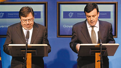 總理考恩(左)和財(cái)長(zhǎng)勒尼漢宣布向歐盟求援,神色凝重。 圖片來(lái)源:香港《文匯報(bào)》