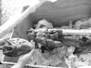 昨天,王女士提供了兩組圖片。一組是廈門寄件時的圖片,圖片顯示當(dāng)時玉龍雕被包裹得嚴(yán)嚴(yán)實(shí)實(shí)的。一組是加拿大客戶收件時的圖片,圖片顯示碩大的木箱里裝滿了泡沫、紙張等填充物,但玉龍雕卻掉了一條腿。