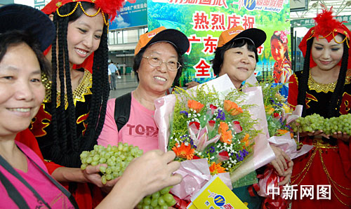 中新網(wǎng)廣州7月31日電 (莫非 林月明)在廣州白云機(jī)場(chǎng)出發(fā)廳,身著漂亮維族服飾的姑娘熱情地將繽紛美麗的鮮花送給游客,盛情邀約廣東游客赴美麗的新疆旅游。這是自“7·5”事件后,廣東首批赴新疆旅游的游客上航班前經(jīng)歷的一幕,意味著暫時(shí)停滯了近一個(gè)月的廣東新疆游市場(chǎng),終于全面恢復(fù)正常。