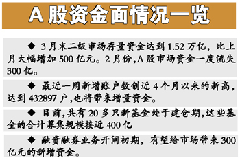 由上海證券報(bào)和申銀萬(wàn)國(guó)研究所聯(lián)合推出的股市月度資金報(bào)告顯示,今年3月末,A股市場(chǎng)的存量資金在經(jīng)歷了近3個(gè)月的盤底振蕩后開始上升,當(dāng)月末二級(jí)市場(chǎng)存量資金達(dá)到1.52萬(wàn)億,比上月大幅增加500億元。這個(gè)跡象,使得二月份一度明顯流失的市場(chǎng)資金面再度回穩(wěn),此前的2月份,A股市場(chǎng)資金一度流失300億。