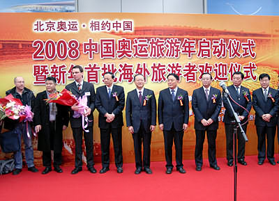 中新網(wǎng)1月2日電 據(jù)國(guó)家旅游局網(wǎng)站消息,2008年元月一日上午10:50分,CA932航班平穩(wěn)地降落在北京首都國(guó)際機(jī)場(chǎng)。飛機(jī)艙門打開(kāi)時(shí),德國(guó)伊卡魯斯旅行社副總裁萊爾夫·琥珀先生接到了來(lái)自北京市旅游局工作人員送上的鮮花。他所率領(lǐng)的德國(guó)234名游客成為2008年北京入境的第一批旅游者。這標(biāo)志著2008年中國(guó)奧運(yùn)旅游年正式啟動(dòng)。