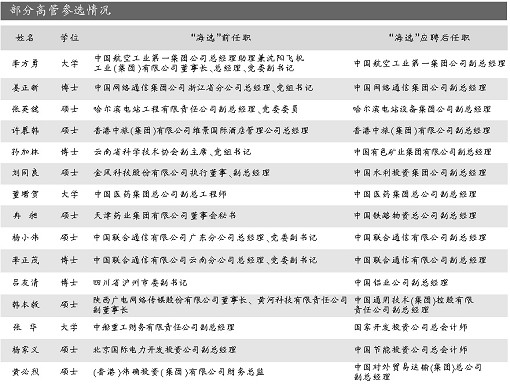 2008年7月8日,國資委發(fā)布消息,將面向海內(nèi)外公開招聘16名央企高管,這已是國資委第6年公開招聘央企領(lǐng)導(dǎo)。據(jù)統(tǒng)計,前5年,通過這種方式一共招聘了91名高管。那么,這些高管現(xiàn)狀如何,這種“海選”的方式是否科學(xué)有效?