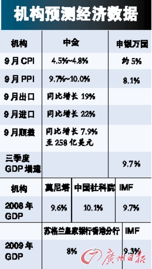 多家機構(gòu)已提前發(fā)布了他們對CPI和PPI的預(yù)測數(shù)據(jù)。此次,各家機構(gòu)高度一致地得出了CPI和PPI有望雙降的結(jié)論。不過,在“保增長”成為宏觀調(diào)控的首要目標(biāo)的背景下, GDP增速回落已經(jīng)成為不能回避的問題,多家機構(gòu)紛紛預(yù)測,三季度經(jīng)濟增速繼續(xù)延續(xù)今年以來的回落態(tài)勢。