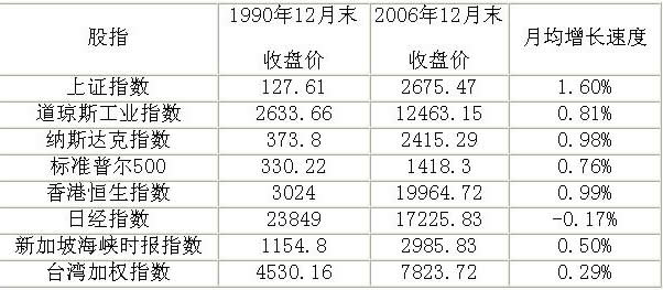 表1 1990年12月末~2006年12月末主要股指平均月增長率