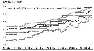 根據(jù)目前對CPI的估算,年初至11月底,預(yù)計CPI累計上升4.6%;而根據(jù)預(yù)測,2007年CPI將達(dá)到4.7%,如果不加息,那么真實利率將為-1%(3.87%×0.95-4.7%)。而且,如果通貨膨脹沒有如央行預(yù)期下降,那么央行將面臨更大的升息壓力。