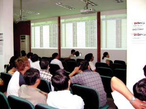 ORS證券公司位于胡志明市第一郡,與胡志明證券交易所一街之隔。隨著越南指數(shù)從2007年3月12日的歷史最高點1170點跌至今年6月的370點低位,幾月以來,這里已經(jīng)成了大多數(shù)股民的“傷心地”。不過,昨天上午9點,想在這里找到一個位子已經(jīng)不太容易。而交易大廳偶爾響起的掌聲更將人們心頭的陰霾一掃而空,“漲了!睅讉股民對自己的收獲很滿意。