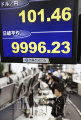 電子牌顯示日經(jīng)指數(shù)跌破1萬點(diǎn)關(guān)口,美元兌日元比價升至101上方。7日上午9點(diǎn)18分?jǐn)z于東京東新橋的外匯.COM。(共同社)