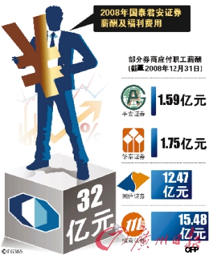 近日記者獲得了一份《2009年國泰君安證券總裁陳耿工作報告》,細(xì)讀中記者發(fā)現(xiàn),國泰君安證券2008年的薪酬及福利費用高達(dá)32億元,遠(yuǎn)遠(yuǎn)超出公司年初預(yù)算數(shù)的20.41億元。即使面對大熊市,國泰君安在滬深兩市的交易量也排在全國所有券商的前三甲。目前國泰君安員工數(shù)大約在3200人左右,按報告中32億元的總薪酬及福利費用計算,平均每個員工去年獲得的總收入就接近100萬元。
