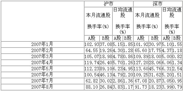 二是在股市投資者的結(jié)構(gòu)中,從事長線投資的機構(gòu)投資者為數(shù)過少。在一個健康的股市中,從事長線投資(持股半年以上)及短線投資的投資者之間應(yīng)當(dāng)保持著動態(tài)的平衡,而在我國股市中不僅散戶的數(shù)量眾多,而且絕大多數(shù)散戶及機構(gòu)投資者(各類基金)都在從事短線投資。我在2003年時就已指出,由于基金具有規(guī)模大、資金充足和人員專業(yè)化的優(yōu)勢,使得它天然地具有操縱市場的沖動,在暴利的驅(qū)使下,其行為也就必然短期化。衡量短線投資程度的主要指標(biāo)是換手率,今年1-8月我國股市的換手率如表6所示: