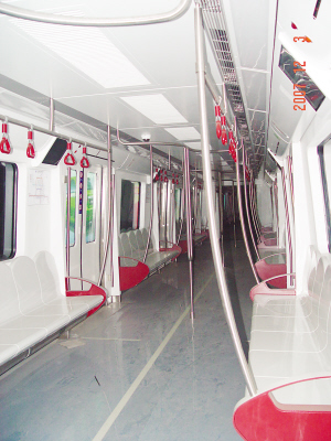 根據(jù)北京市軌道交通建設(shè)管理公司的介紹,10號線新車內(nèi)飾以白色為主,配有紅色扶手,為增加車內(nèi)的美感,車內(nèi)扶手均帶有弧度。新車車體材料全部采用高強(qiáng)度不銹鋼,車廂內(nèi)為大通道設(shè)計,每輛車每側(cè)設(shè)4個雙扇內(nèi)藏電控電動車門,車前端設(shè)緊急疏散門。