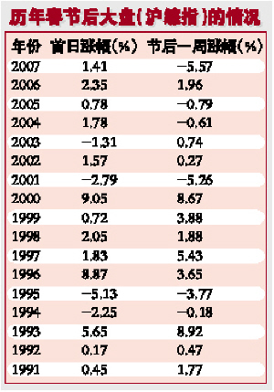 統(tǒng)計(jì)還顯示,從1991年春節(jié)以來(lái)的17年中,只有4年春節(jié)后首個(gè)交易日市場(chǎng)沒(méi)有“開(kāi)門(mén)紅”,分別是1994年、1995年、2001年、2003年。另外有13年,春節(jié)后首個(gè)交易日大盤(pán)均出現(xiàn)不同程度的上漲,占統(tǒng)計(jì)樣本的近80%。(見(jiàn)表)