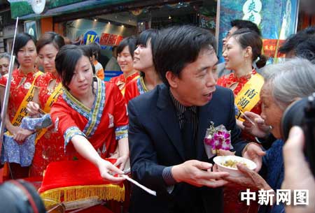 中新網(wǎng)廣州4月7日電 (記者 莫非 通訊員 林月明)大方漆器、布依地毯、蠟染、玉屏簫笛等讓人眼花繚亂,貴陽(yáng)的氣息撲面而來(lái)。廣東首家“貴陽(yáng)形象店”7日在南湖國(guó)旅·西部假期位于廣州上下九步行街的營(yíng)業(yè)點(diǎn)落戶。在開(kāi)業(yè)現(xiàn)場(chǎng),貴陽(yáng)旅游局副局長(zhǎng)方隨洪更是走上街頭,請(qǐng)老廣品嘗正宗美味的酸湯魚(yú),同時(shí)還將香囊等貴陽(yáng)的小特產(chǎn)親手贈(zèng)送給市民,邀請(qǐng)老廣齊赴貴陽(yáng)旅游。