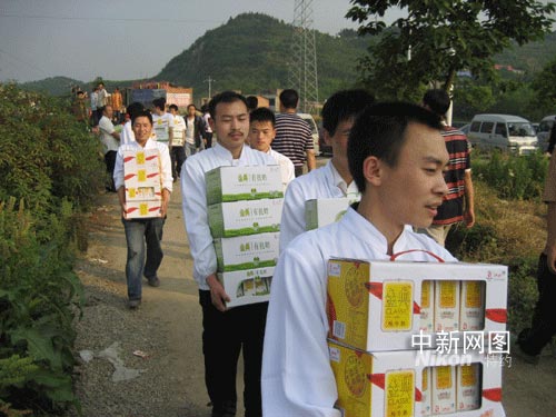 結(jié)合實際情況,從伊利邛崍工廠劉志亮帶來的救援人員和綿陽云永剛組織的人員 20人,加上一些在當(dāng)?shù)氐闹驹刚撸医M織了幾十個人隊伍,決定把牛奶靠人力搬進(jìn)去,搬去體育場,并發(fā)給災(zāi)民。晚上看他們拍的照片,發(fā)現(xiàn)真是一支浩浩蕩蕩的搬牛奶的隊伍。