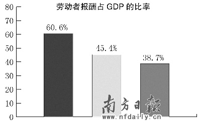 2000年—2006年間,勞動(dòng)者報(bào)酬占GDP的比率從45.4%降到38.7%,6年降低了6.7個(gè)百分點(diǎn)。如果與改革開(kāi)放初1978年的60.6%相比,下降幅度則達(dá)21.9個(gè)百分點(diǎn)。而且,廣東居民收入增速慢于東部沿海5省份,也慢于泛珠九省。
