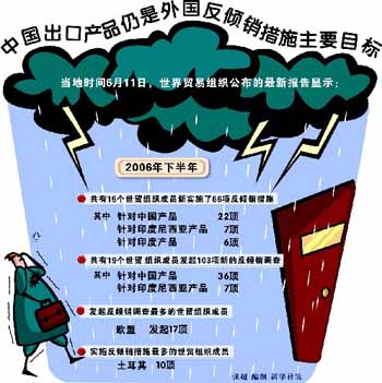 世貿組織早前發(fā)布的反傾銷統(tǒng)計報告顯示,從1995年至2006年,中國已連續(xù)12年成為世界上遭受反傾銷調查和被實施反傾銷措施數量最多的國家,2007年全球新立案的反傾銷調查雖呈下降趨勢,但中國仍然是全球反傾銷調查的頭號目標國。