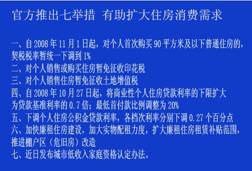 從2008年11月1日起,對(duì)個(gè)人首次購(gòu)買90平方米及以下普通住房的,契稅稅率暫統(tǒng)一下調(diào)到1%;對(duì)個(gè)人銷售或購(gòu)買住房暫免征收印花稅;對(duì)個(gè)人銷售住房暫免征收土地增值稅。地方政府可制定鼓勵(lì)住房消費(fèi)的收費(fèi)減免政策。[詳細(xì)內(nèi)容]