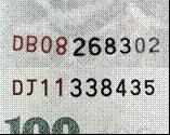 一般假鈔使用普通黑色油墨膠印冠字號碼,其形態(tài)與真鈔冠字存在差異且不具備磁性特征。且假鈔號碼不規(guī)則、排列零亂(見下圖)。