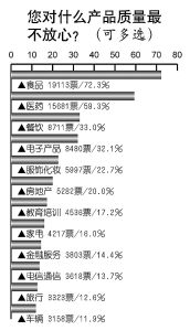 本次民調(diào)發(fā)現(xiàn),如今公眾對(duì)“食品”和“醫(yī)藥”的質(zhì)量最不放心,分別有72.3%和59.3%的人選擇此項(xiàng)。接下來依次是:餐飲(33.0%)、電子產(chǎn)品(32.1%)、服飾化妝(22.7%)、房地產(chǎn)(20.0%)、教育培訓(xùn)(17.2%)、家電(16.0%)、金融服務(wù)(14.4%)、電信通信(13.7%)、旅行(12.6%)、車輛(11.9%)。