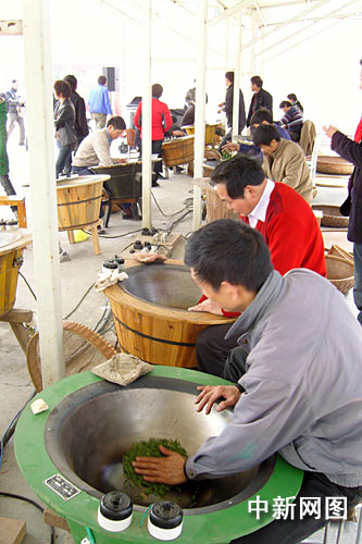 3月25日上午8時(shí),剛下過(guò)濛濛細(xì)雨的天空漸漸放晴,西湖區(qū)2009年西湖龍井“炒茶王”爭(zhēng)霸賽在龍塢茶葉交易中心順利舉行。說(shuō)來(lái)也巧,在首輪抽簽環(huán)節(jié)中,兩位往年的“炒茶王”相繼抽到了1號(hào)和2號(hào),面對(duì)面地形成了“炒茶王”爭(zhēng)霸賽的第一個(gè)高潮——“雙王爭(zhēng)霸”的精彩場(chǎng)面。為公平比賽,此次所有參賽選手炒制的青葉原料都來(lái)自同一塊茶地。比賽中,每位選手都領(lǐng)到了2斤青葉,在經(jīng)過(guò)殺青、輝鍋、整理、二次輝鍋等工序后,以抽簽號(hào)裝袋后送由國(guó)家級(jí)一、二級(jí)評(píng)茶師和龍井茶葉產(chǎn)業(yè)協(xié)會(huì)秘書(shū)長(zhǎng)等評(píng)茶高手組成的評(píng)審團(tuán)評(píng)審。評(píng)審團(tuán)則通過(guò)觀、聞、品等方法,對(duì)各位選手炒制的茶葉外形、香氣、滋味、湯色、葉底等進(jìn)行打分,最后以綜合得分的高低產(chǎn)生“炒茶王”。