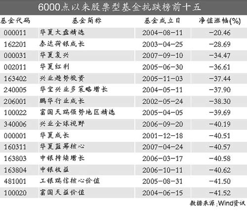 從6100多點(diǎn)以來,上證指數(shù)的跌幅已超過了65%。而華夏紅利等4只基金的凈值損失不到其一半。華夏大盤的凈值損失只有20%左右。興業(yè)趨勢(shì)、華寶多策略增長(zhǎng)等基金凈值也損失了不到40%。相反,部分基金在熊市的跌幅甚至超過了60%。