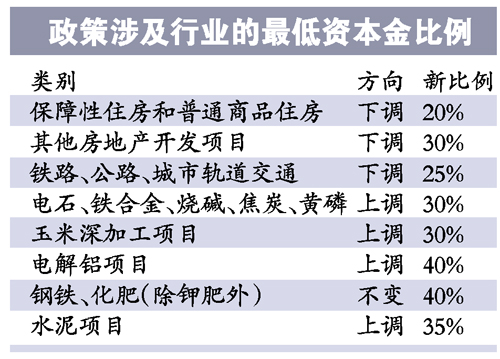 日前,國(guó)務(wù)院常務(wù)會(huì)議再次調(diào)整固定資產(chǎn)投資項(xiàng)目的資本金比例,以緩解4萬(wàn)億刺激計(jì)劃的資本缺口。此前在4月29日,國(guó)務(wù)院常務(wù)會(huì)議決定調(diào)整固定資產(chǎn)投資項(xiàng)目資本金比例。