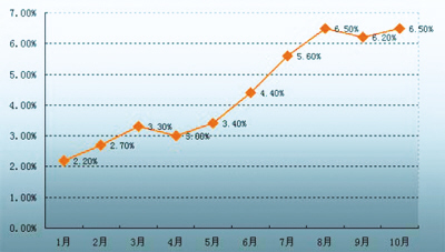 財經(jīng)評論員葉檀認為,央行暫不加息可能來自兩個考量,一是決策層判斷目前國內(nèi)通脹壓力并不大,另一個則是隨后更加變通的匯率政策能夠緩解國內(nèi)的通脹壓力。9月份的CPI上升6.2%,10月份則上升到6.5%,這和8月份CPI增幅創(chuàng)下的逾10年最高點持平。盡管各月的通貨膨脹率有所波動,但大多數(shù)經(jīng)濟學(xué)家預(yù)計今年全年的通脹率會在4.5%左右。也因為這樣,有學(xué)者估計來年央行可能調(diào)高CPI的目標值,將其上調(diào)至4%甚至5%。