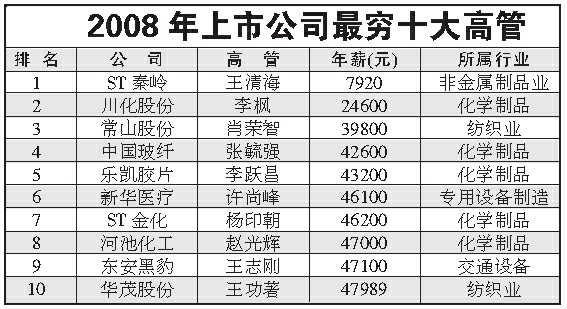 根據這份榜單,2008年上市公司最窮總經理30人的平均年薪是56373元,而最窮總經理前十名的平均年薪只有39251元。