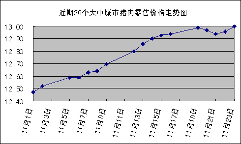 中新網(wǎng)11月26日電 國(guó)家發(fā)改委網(wǎng)站消息稱,據(jù)國(guó)家發(fā)展改革委價(jià)格監(jiān)測(cè)中心監(jiān)測(cè),上周(11.19-11.23,下同)全國(guó)36個(gè)大中城市豬肉(精瘦肉)集市平均零售價(jià)格每500克為12.97元,比上期(11.12-11.16,下同)上漲0.62%,漲幅比上期縮小1.44個(gè)百分點(diǎn)。