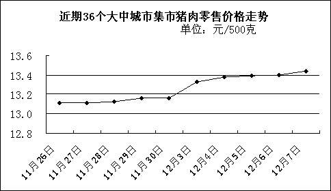 中新網(wǎng)12月10日電 國(guó)家發(fā)改委網(wǎng)站消息稱(chēng),據(jù)國(guó)家發(fā)展改革委價(jià)格監(jiān)測(cè)中心監(jiān)測(cè),上周(12.3-12.7,下同)全國(guó)36個(gè)大中城市集市豬肉(精瘦肉)平均零售價(jià)格每500克為13.39元,比上期(11.26-11.30,下同)上漲1.98%。