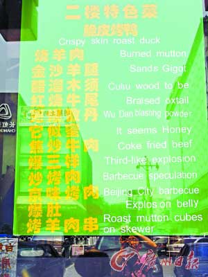 在《中文菜單英文譯法》出臺(tái)之前,北京中式餐館常常開起“國(guó)際玩笑”,比如紅燒獅子頭被譯成“RedBurnedLionHead”(燒紅了的獅子頭),“驢打滾”被譯成“Rollingdonkey”(打滾的驢),“老虎菜”被錯(cuò)譯成“tigerdish”(老虎做的菜),“童子雞”被譯成“Chickenwithoutsexuallife”(沒有性生活的雞)。老外們往往啼笑皆非或嚇得不輕。
