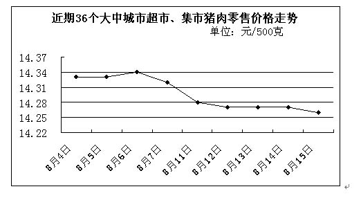 中新網(wǎng)8月18日電 據(jù)國(guó)家發(fā)改委網(wǎng)站消息,國(guó)家發(fā)改委價(jià)格監(jiān)測(cè)中心監(jiān)測(cè)顯示,上周(8月11日-8月15日)全國(guó)36個(gè)大中城市超市、集市豬肉(精瘦肉)平均零售價(jià)格每500克為14.27元,比前一周(8月4日-8月8日,下同)下降0.42%。