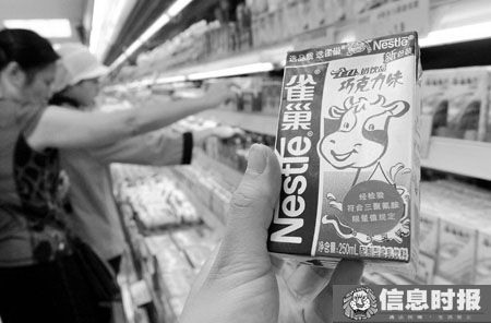 在家樂福超市萬國廣場(chǎng)店,記者看到光明純牛奶250毫升裝悄然回歸賣場(chǎng);在吉之島超市天河城店,記者看到,昨日還未貼上綠簽的雀巢巧克力味和草莓味的配制型含乳飲料,昨日悄然換新裝。其生產(chǎn)日期標(biāo)注為“2008年6月6日”,早于9月14日這一“分水嶺”。同時(shí),記者在7-11便利店天河南店也看到了雀巢這兩款配制型含乳飲料重新擺上貨架售賣。