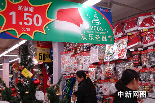 在杭州市下城區(qū)的樂購超市,圣誕專柜打出醒目的廣告,一頂圣誕帽只需1.5元,好又多鳳起店更是甩出一元特價(jià)圣誕帽,歐尚、世紀(jì)聯(lián)華等超市也低價(jià)銷售。一位正在挑選圣誕帽的顧客說:“一斤白菜也就一塊多,今年圣誕飾品在價(jià)格方面便宜了不少。以往的折扣價(jià)都在節(jié)日過后才有,現(xiàn)在離圣誕節(jié)還有十天,就已經(jīng)打折了。”