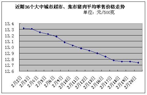 中新網(wǎng)2月23日電 據(jù)國家發(fā)展改革委價(jià)格監(jiān)測(cè)中心監(jiān)測(cè),上周(2009年2月16日~2009年2月20日,下同)全國36個(gè)大中城市集市、超市豬肉(精瘦肉)平均零售價(jià)格每500克為12.78元,與前一周(2009年2月9日~2009年2月13日,下同)相比下降1.62%。