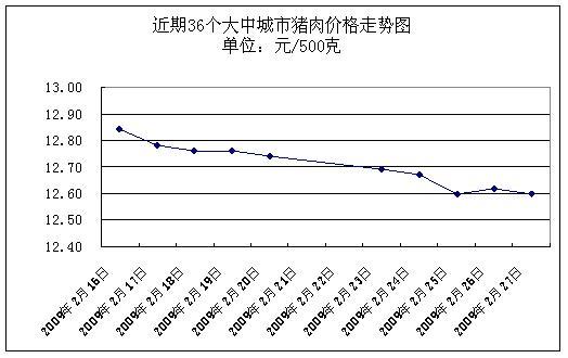 中新網(wǎng)3月2日電 據(jù)國(guó)家發(fā)展改革委價(jià)格監(jiān)測(cè)中心監(jiān)測(cè),上周(2009.2.23-2009.2.27,下同)全國(guó)36個(gè)大中城市集市、超市豬肉(精瘦肉)平均零售價(jià)格每500克為12.64元,與前一周(2009.2.16-2009.2.20,下同)相比下降1.10%。
