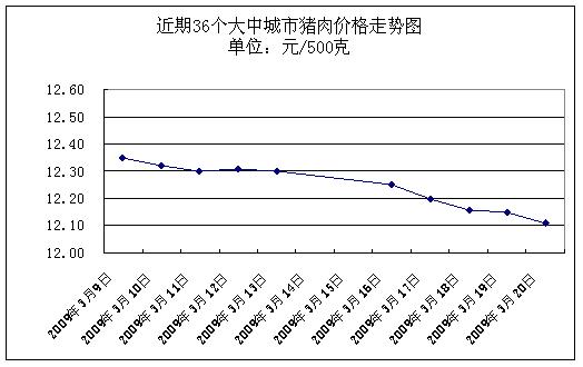 中新網(wǎng)3月23日電 據(jù)國家發(fā)展改革委價(jià)格監(jiān)測中心監(jiān)測,本周(2009.3.16-2009.3.20,下同)36個(gè)大中城市集市、超市豬肉(精瘦肉)平均零售價(jià)格每500克為12.17元,與前一周(2009.3.9-2009.3.13,下同)相比下降1.22%。