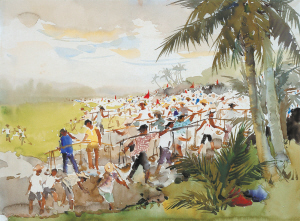 我鉆進(jìn)椰子林作畫,其熱無比,連油色的錫管都燙手。忘了在何處,林中小蟲特多,咬得緊,穿著長(zhǎng)褲、長(zhǎng)袖襯衣,且將袖口和衣領(lǐng)都包得嚴(yán)嚴(yán)實(shí)實(shí),但回到宿店才知滿身都是紅塊塊,奇癢難忍,店主頗可憐我,說:氓!氓!我聽不懂廣東話,她用筆寫,原來是蚊。
