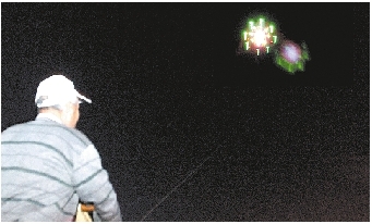 根據(jù)不明飛行物大概的方位,記者跟著“飛行物”方向一路尋找,發(fā)現(xiàn)不明飛行物就在火車頭體育場上空附近,體育場內(nèi)有人在放夜風箏。原來燈光是夜風箏上夜光設備不斷地發(fā)出不同顏色的光。