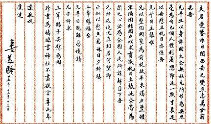 兄不自檢束,竟遭不測(cè)之禍,致令至愛憂傷,罪何可言。今事既至此,惟有不愧為吾妻之丈夫,亦不愧負(fù)吾總理與吾父吾母一生之教養(yǎng),必以清白之身還我先生,只求不愧不怍無負(fù)上帝神明而已。家事并無掛念,惟經(jīng)國(guó)與緯國(guó)兩兒皆為兄之子,亦即吾妻之子,萬望至愛視如己出,以慰吾靈。經(jīng)兒遠(yuǎn)離十年,其近日性情如何,兄固不得而知;惟緯兒至孝知義,其必能克盡孝道。彼于我遭難前一日尚來函,極欲為吾至愛盡其孝道也。彼現(xiàn)駐柏林,通信可由大使館轉(zhuǎn)。甚望吾至愛能去電以慰之為感。
