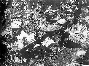炮火也同時(shí)驚醒了位于4公里外的第45師師部。師長(zhǎng)崔建功飛快地跑上山頂向南眺望,只見十幾里外炸點(diǎn)閃爍成一線的前沿陣地上,有兩個(gè)點(diǎn)亮得格外刺眼。緊隨其后跑上來的作戰(zhàn)科長(zhǎng)宋新安立即判明:“那是597.9高地和537.7高地北山。”敵人是主攻還是佯攻?通訊中斷,戰(zhàn)斗進(jìn)行了幾個(gè)小時(shí),敵人的作戰(zhàn)企圖、兵力規(guī)模、戰(zhàn)術(shù)手段仍然一概不清。偵察連派人去前線了解情況,第一批人在半路上犧牲了,第二批兩個(gè)人幾經(jīng)周折終于來到597.9高地的5號(hào)陣地,一看陣地上只剩下一個(gè)戰(zhàn)士了,美軍正蜂擁而來,他倆毫不猶豫立即投入戰(zhàn)斗……