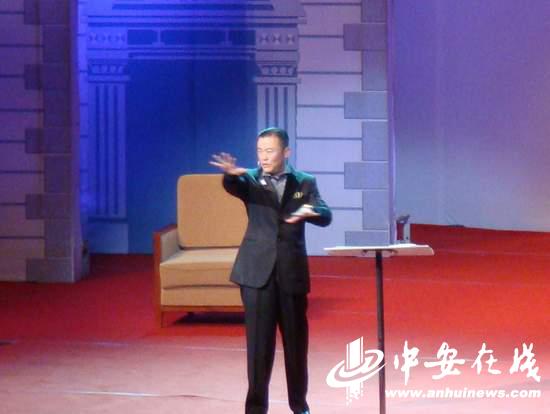 油亮亮的小分頭,筆挺熨帖的黑色禮服,操著“國語”說海派清口,一個(gè)人在臺(tái)上連說帶演緊忙活,他就是周立波。9月18日晚,周立波用他“上海話+普通話+合肥話”的精彩表演則讓現(xiàn)場笑聲不斷,掌聲雷鳴。