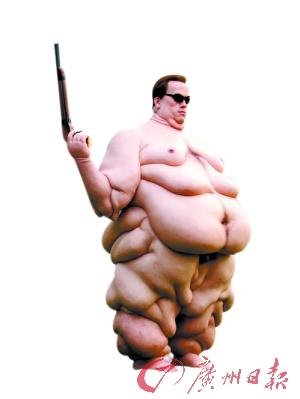 一座220厘米高、以美國明星施瓦辛格為原型創(chuàng)作的“肥胖”雕塑,近日起在錦漢展覽中心首屆“藝術(shù)廣東”上展出。其夸張而荒誕的手法呈現(xiàn)出一種詭異的表現(xiàn)力。這是藝術(shù)家舒勇于2006年至2008年創(chuàng)作的硅膠雕塑,他表示其創(chuàng)作背景來自因美國爆發(fā)的金融危機(jī)而引發(fā)的全球金融海嘯。