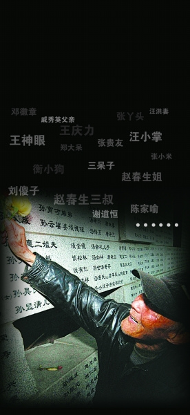 記者拿到部分即將刻上“哭墻”的姓名,發(fā)現(xiàn)有的遇難者無姓也無名,比如三呆子、二道標等;有的有姓但無名,比如劉傻子、王老二、許小四等;還有的只是某某人親戚,比如趙春生三叔、趙春生姐、戚秀英父親、龐世昌哥哥等。