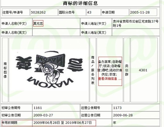 于是,莫元忠于2005年11月28日注冊了“莫言”餐廳類商標(biāo),掛起了“莫言餃子館”的牌子。記者在中國商標(biāo)網(wǎng)查到,2009年3月27日,“莫言”餐廳類商標(biāo)初審公示,同年6月28日正式注冊成功,專用權(quán)期限一直到2019年6月28日。