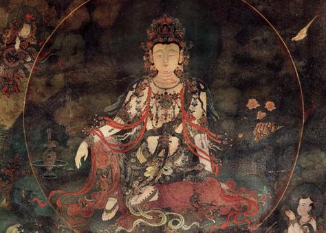 最妙絕的當數《水月觀音圖》。傳統壁畫里的觀音形象,多數強調“寶相莊嚴”,這一幅卻美麗不可方物。觀音像頭戴寶冠,肩披輕紗,服飾富麗復雜,層疊交錯,互為穿插。一襲透明紗羅帔巾曼妙輕舞,貼近看,輕柔的紗巾上裝飾有成千上萬朵六角小菱花,每朵菱花都用白云母勾勒,每一片花瓣又由40多根金線繪成,線條細如蛛絲,朵朵絲絲不亂,毫無脫漏之處。整件紗羅帔巾薄如蟬翼,輕柔透體,臨風飄動,幾乎要飛出壁面,畫工之細微精妙登峰造極,被譽為觀世音菩薩造像之最。