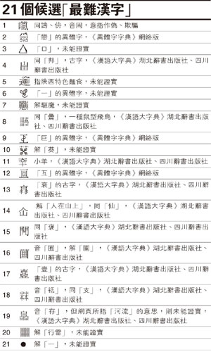 中新網(wǎng)10月22日電 身為中國人,就應該懂中文字,你又認得幾多個?據(jù)香港明報報道,有網(wǎng)民在網(wǎng)上搞“最難漢字”評選活動,選出21個一般人不認識的生字候選,個個令人摸不著頭腦。