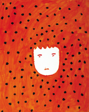郭海平問(wèn)記者:“如果是你,會(huì)如何表達(dá)‘掙扎’的抽象精神?”隨即他讓記者看了張玉寶的作品:沖擊力極強(qiáng)的橘紅色背景上,被扎上了無(wú)數(shù)個(gè)錯(cuò)亂且刺眼的黑點(diǎn),它們環(huán)繞在一個(gè)人頭四周,人臉表情有些呆滯。色彩強(qiáng)烈的反差,讓人感覺(jué)周?chē)植赖谋尘,隨時(shí)可能將人頭吞噬,人頭似在苦苦掙扎。整個(gè)畫(huà)面是那么干凈,但內(nèi)涵卻非常豐富。無(wú)論如何,你都不能猜到這是一個(gè)未經(jīng)任何繪畫(huà)訓(xùn)練的人畫(huà)出來(lái)的東西。