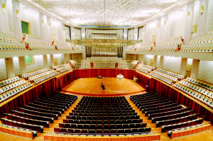在公共空間的另一側(cè),是設(shè)計(jì)獨(dú)特的戲劇場。戲劇場共計(jì)有1035個(gè)席位,具有濃郁民族色彩的絲布墻面體現(xiàn)出戲劇場親切、熱烈而傳統(tǒng)的氣氛,平時(shí)主要以戲曲、話劇演出為主。劇場內(nèi)設(shè)置的“鼓筒式”轉(zhuǎn)臺是根據(jù)德累斯頓歌劇院和英國皇家芭蕾舞劇院的舞臺組合出的新型轉(zhuǎn)臺,可以達(dá)到15塊臺邊移動(dòng)、邊升降、邊旋轉(zhuǎn)的舞臺效果———演出話劇《江姐》的時(shí)候,只消升起兩塊臺板構(gòu)成一個(gè)立體矩形,前邊再放上一只火盆,就構(gòu)造出渣滓洞監(jiān)獄的陰森場景;如果把這些臺板漸次升起,就是可供合唱團(tuán)站立的標(biāo)準(zhǔn)性臺階;如果把臺板按需要升起后再進(jìn)行圓臺旋轉(zhuǎn),那么戲劇導(dǎo)演可以在數(shù)個(gè)舞臺場景瞬間切換。