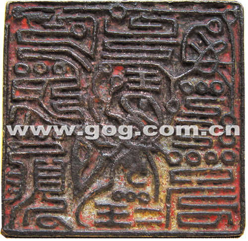 只見這枚青銅大印面為方形,邊長(zhǎng)為5.5厘米,厚1.5厘米,高3.8厘米。印面陽刻圖文,中央有一圖形,似人非人的蝴蝶圖案;環(huán)繞圖形有三排文字,似篆非篆,大印上有長(zhǎng)方形印把,把高6.5厘米,把上陰刻有一個(gè)“上”字形的圖案。左側(cè)是一個(gè)人名,有兩個(gè)“王”字分別在圖案的上下方,末尾的字似為篆體“總印”。印面下方左右有“多德”二字;上下各有兩個(gè)“王”字,印中間有28個(gè)圓圈符號(hào)圍繞著蝴蝶。