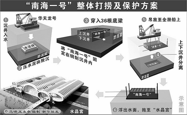 從2002年下半年至2006年6月,廣東省文化廳、國(guó)家博物館水下考古中心、交通部廣州打撈局等單位,先后對(duì)整體打撈方案進(jìn)行了6次修改,國(guó)家文物局也組織有關(guān)專家對(duì)其方案進(jìn)行了4次論證。2006年6月15-17日,國(guó)家文物局組織22位國(guó)內(nèi)權(quán)威專家對(duì)《“南海一號(hào)”整體打撈及保護(hù)方案》進(jìn)行了最后一次論證,一致認(rèn)為該方案“施工工藝先進(jìn)、數(shù)據(jù)可靠、設(shè)計(jì)合理”,最終獲國(guó)家文物局的批準(zhǔn)。